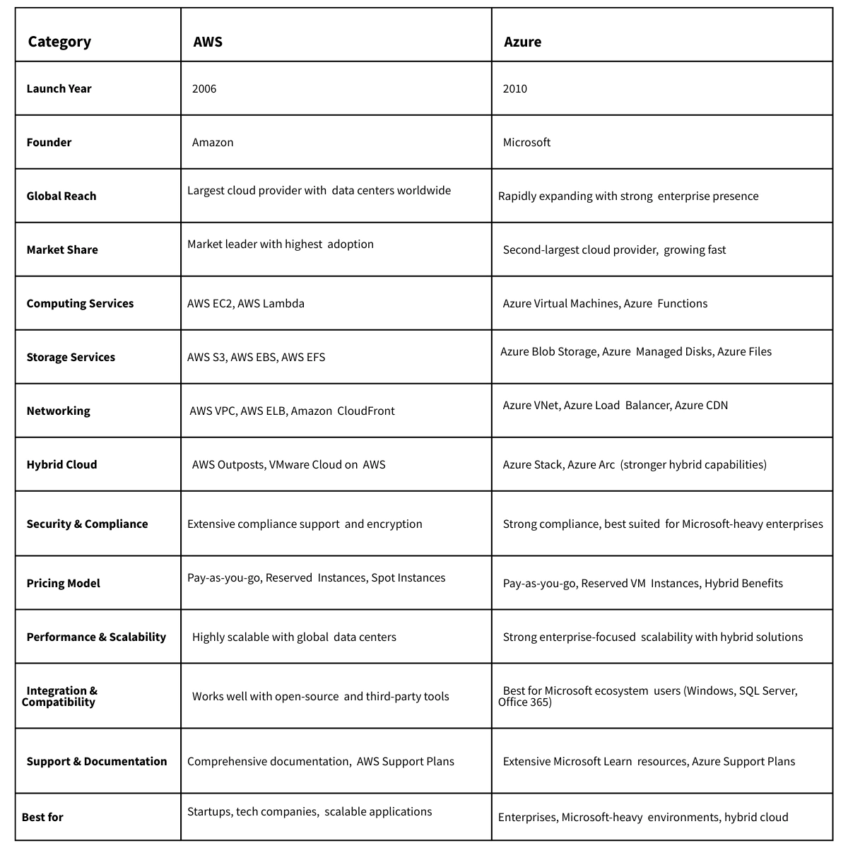 Global Infrastructure: AWS and Azure have global footprints with data centres in many geographies. Geographic coverage lets customers deploy apps and services closer to users, boosting performance, latency, and data sovereignty.