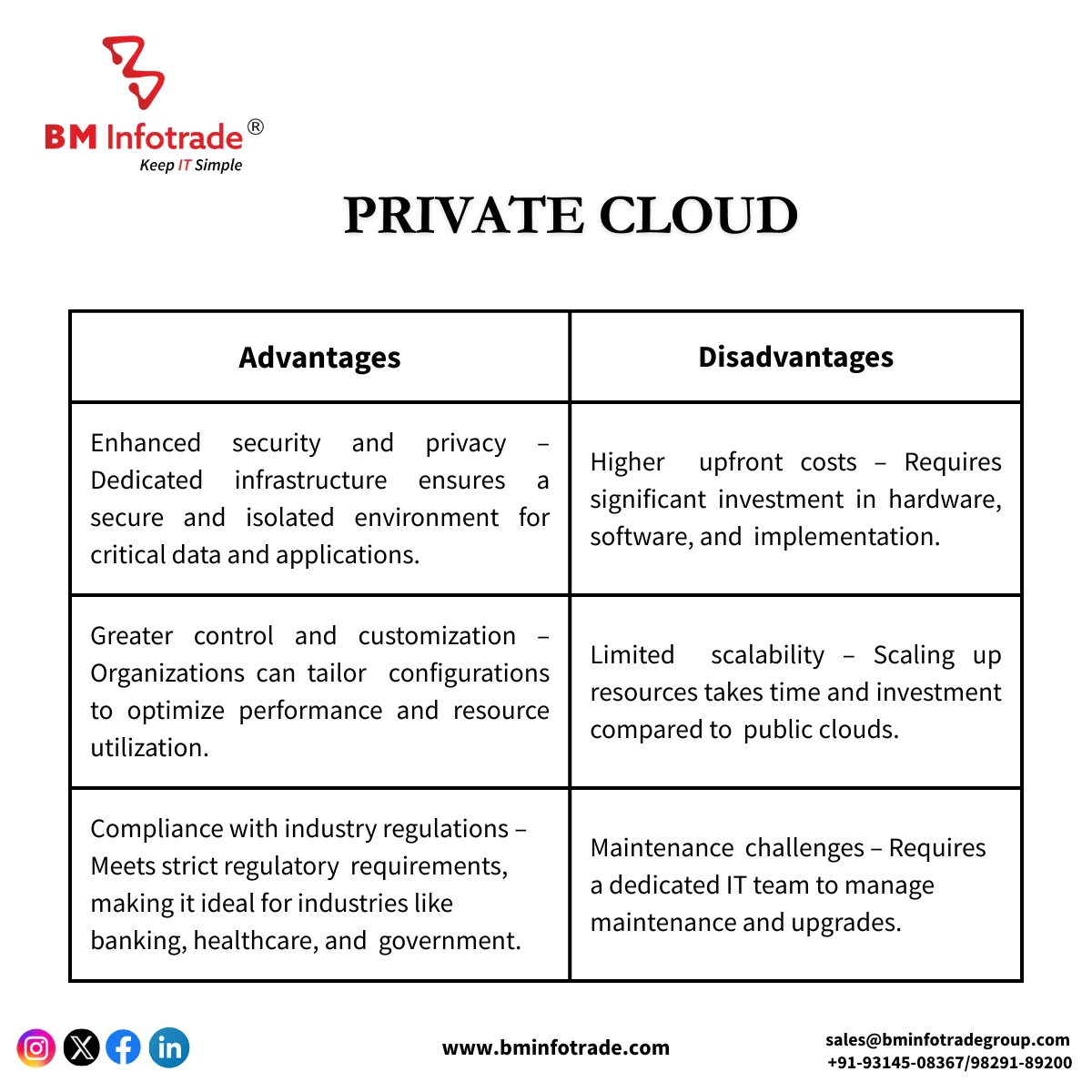 Maintenance and upgrades are the organization's or service provider's duty. The Private Cloud infrastructure needs a specialised IT team to maintain its health and efficiency.