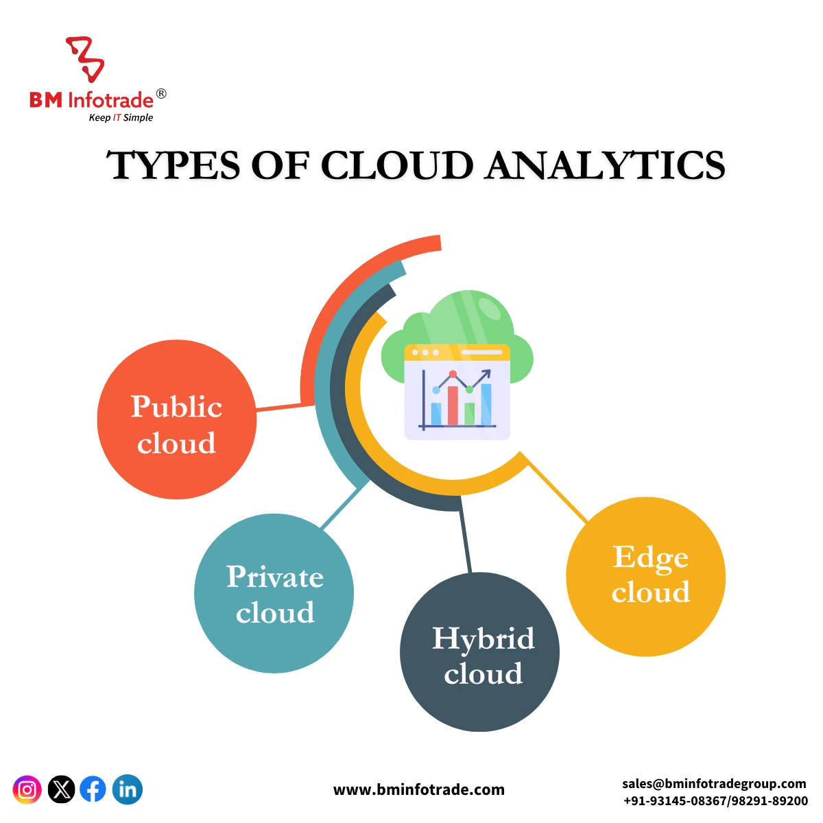- Hybrid cloud: Data may be kept on systems that are both on-premises and in the cloud. These data can be examined using cloud-based analysis tools. A mix of public and private infrastructure is used to deliver services in an on-demand cloud analytics service. Information is secured and secure connectivity with end users is made possible by using private hardware and software.