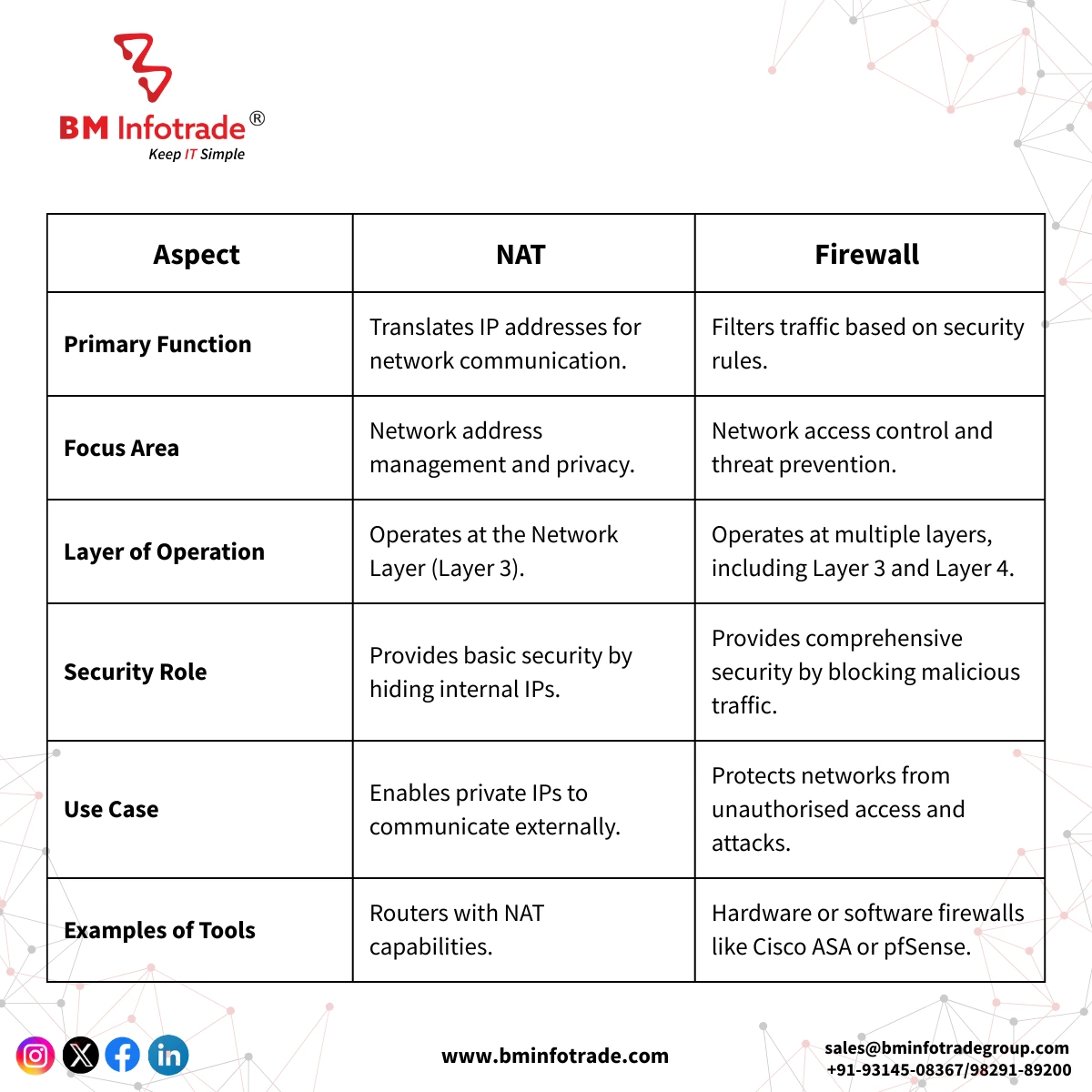 Although NAT and firewalls both contribute to network security, they have distinct purposes and functionalities. Here’s a comparison of their key differences: