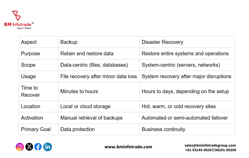 - Complementary Strategies: Backup can get the deleted files, while disaster recovery can reinstate all operational processes of your organisation.