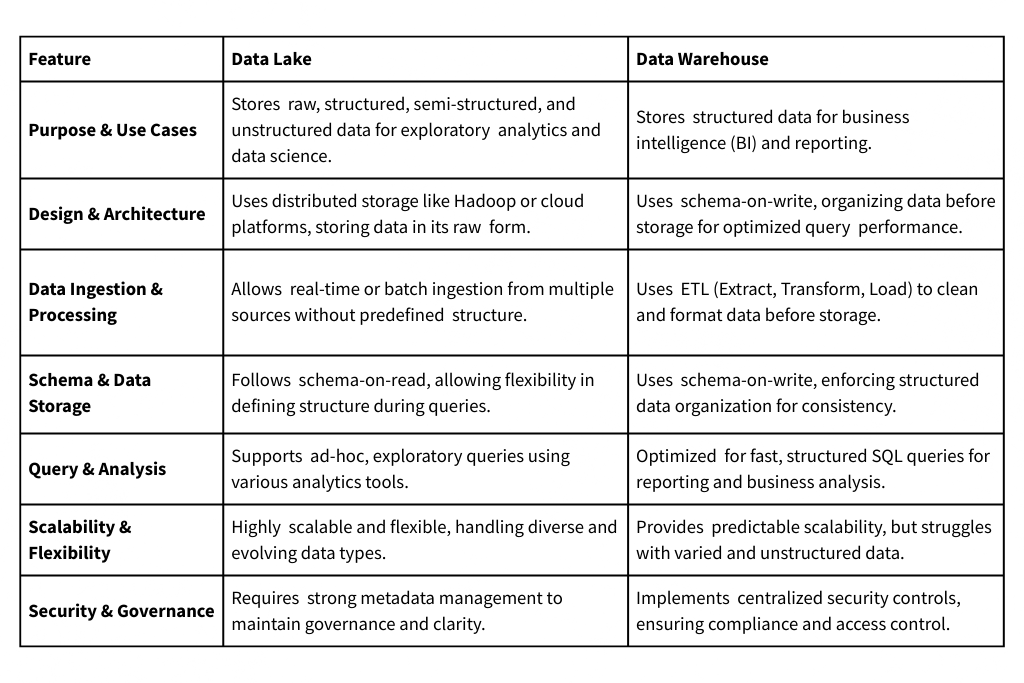 Structured query execution and analytical processing are data warehouse strengths. Complex SQL queries run fast and scalable in Data Warehouses for business intelligence and reporting. Data in the warehouse is arranged for efficient processing and retrieval of curated datasets.