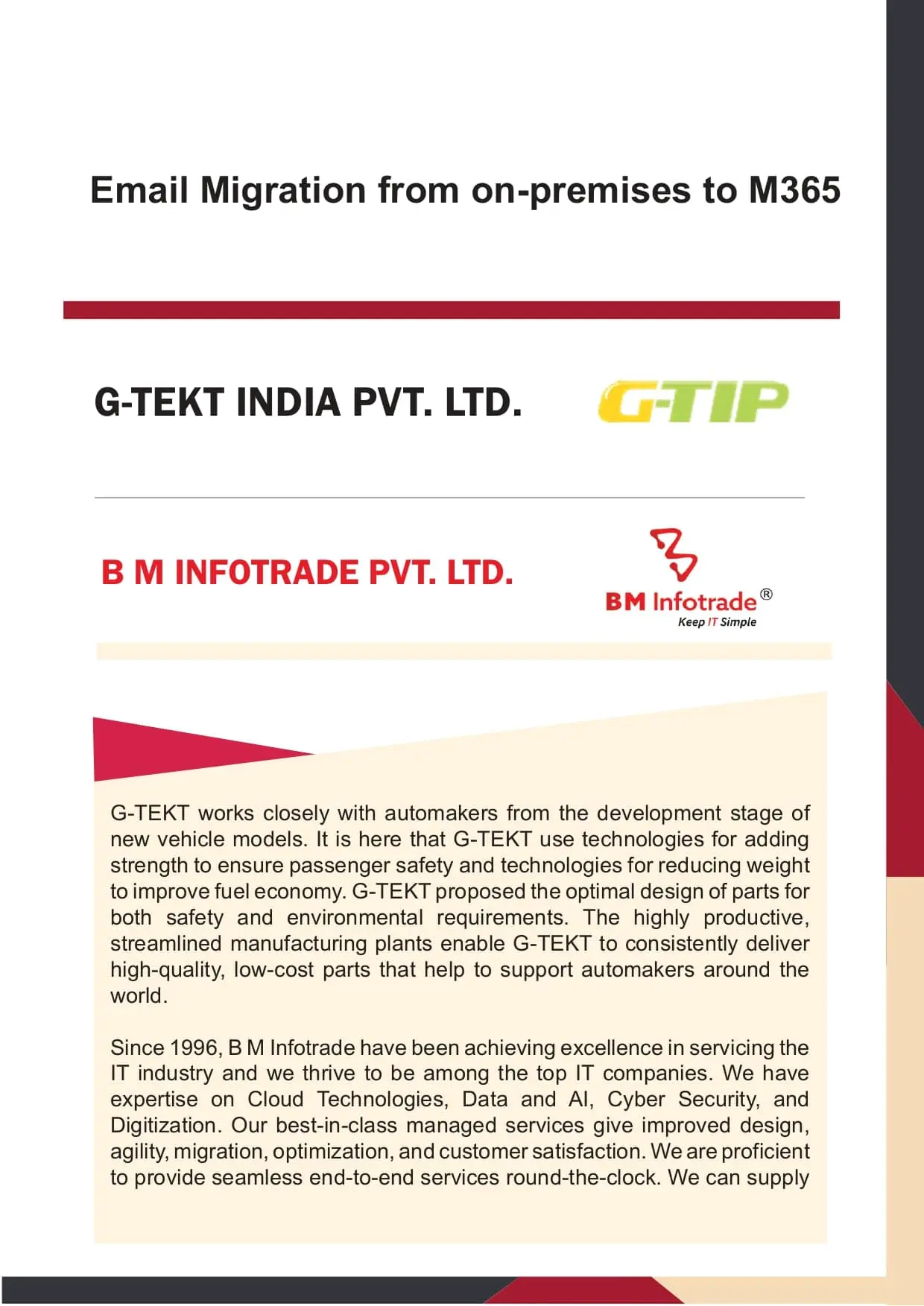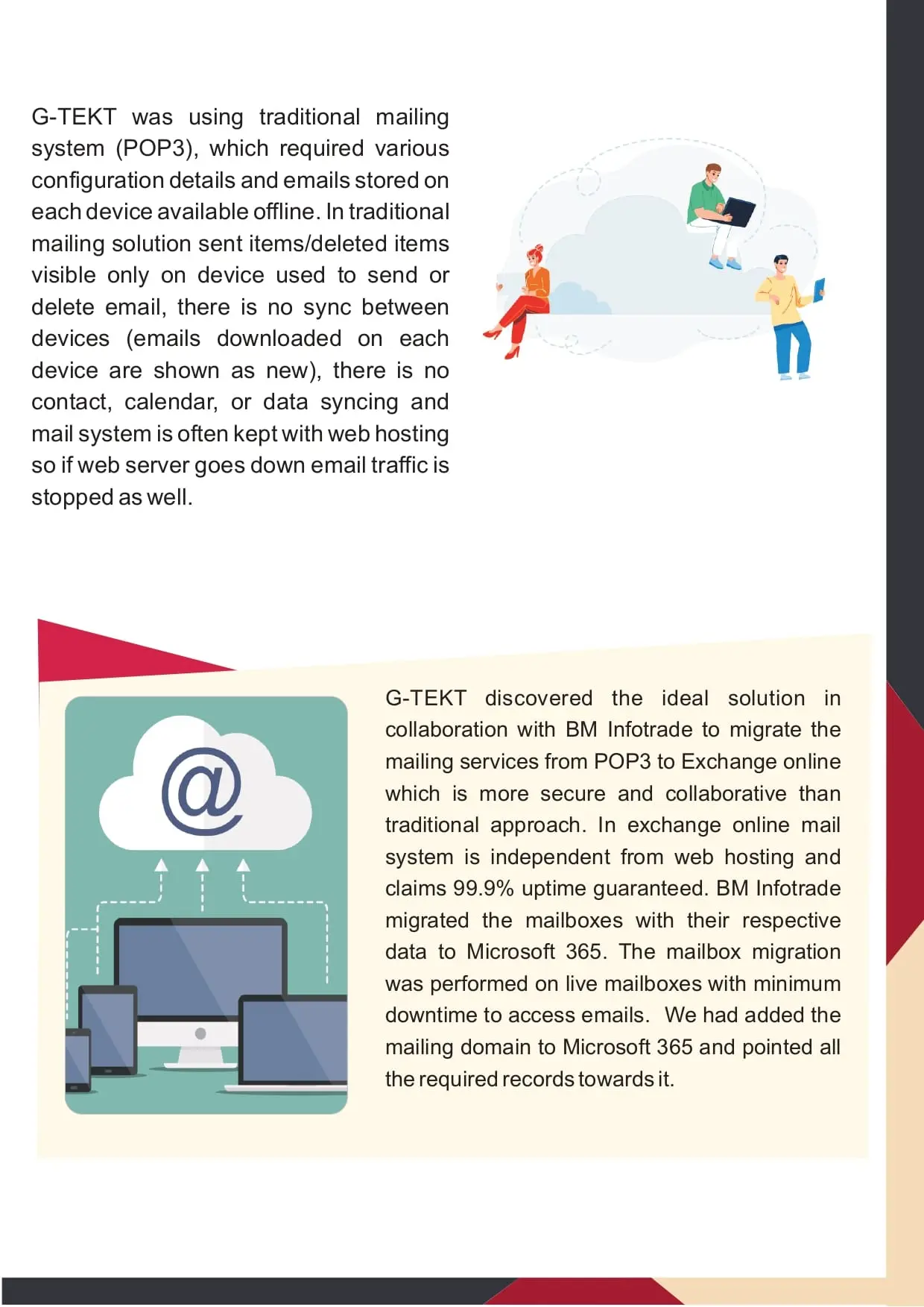 G-TEKT discovered the ideal solution in collaboration with BM Infotrade to migrate the mailing services from POP3 to Exchange online which is more secure and collaborative than traditional approach.